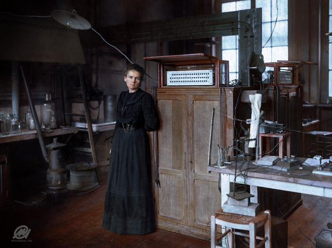Marie Curie oma Pariisi laboris, 1912 – esimene naine, kes sai Nobeli preemia, uuris raadiumiviaali, mille nõrk kuma valgustab tema keskendunud ilmet avastusinstrumentide keskel.
