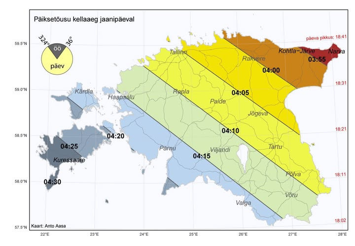 Aasta pikim päev ehk suvine pööripäev lõppes tund tagasi, aga see-eest jaanipäev on ju veel ees. Tartu Ülikooli geograafia osakond on maha saanud huvitava joonisega, mis näitab jaanipäeval tõusva Päikese suunda ja selle aja erinevust isegi meie pisikese Eestimaa eri nurgas.