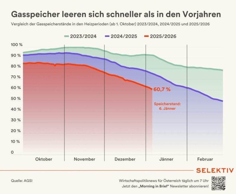 Sellest ajast alates on gaasivarud läänest (läbi Saksamaa ja Itaalia) märkimisväärselt suurenenud ning paralleelselt on arendatud alternatiivseid hoidlaid. Austria hoidlad on viimastel aastatel üldiselt hästi täidetud olnud – kuid isegi siin on 2025/26. aasta talvel ilmne langus: 2025. aasta detsembri lõpus oli ladude tase AGSI andmetel umbes 77 protsenti, võrreldes aasta varem peaaegu 90 protsendiga.