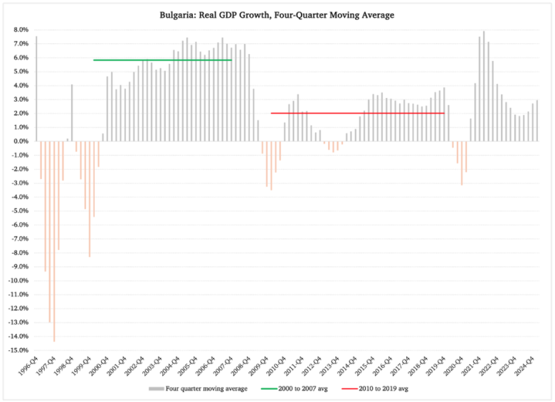 Bulgaaria majandusse süvenemine ei nõua sügavat sukeldumist, et märgata, millal asjad halvemuse poole pöördusid – see on aga kõhedusttekitavalt hästi seotud 2007. aasta Euroopa Liiduga liitumisega. Joonis 1 näitab Bulgaaria SKP reaalset aastakasvu (veerud) ja lisab aastate 2000–2007 (roheline) ja 2010–2019 (punane) keskmise: