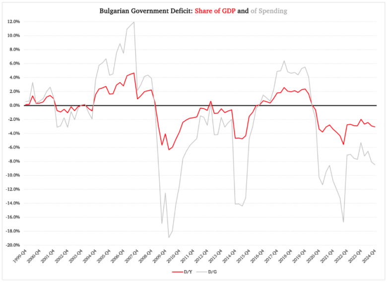 Kuigi uusimad numbrid – mis näitavad puudujääki veidi alla 3% SKPst – hoiavad Bulgaariat ELi stabiilsuse ja kasvu paktiga seatud piirides, räägib riigi varasem ajalugu murettekitavamat lugu. Pärast ELiga liitumist on eelarvepuudujäägid olnud sagedasemad kui ülejäägid, mis tekitab muret Bulgaaria valitsuse fiskaalse tuleviku pärast. Ma eeldaksin püsivaid puudujääke ja meeleheitlikke meetmeid, mida riigi seadusandja on võtnud, et hoida neid ametlikult stabiilsuspakti lävest allpool.