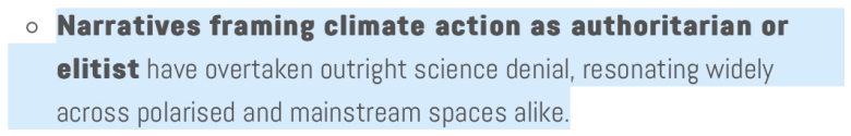 Aruande ideoloogiline fookus selgub järgmistest lõikudest: „Narratiivid, mis kujutavad kliimameetmeid autoritaarsete või elitistlikena, on üle võtnud otsese teaduse eitamise – ja leiavad laialdast vastukaja nii polariseerivates kui ka peavoolu diskursuseruumides.“