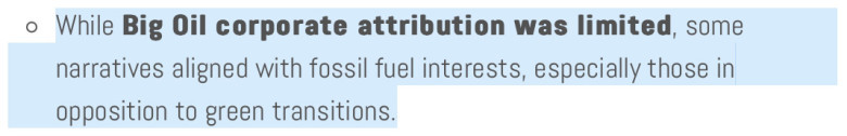 See hõlmab ilmselt ka arvamusi, mis on kooskõlas fossiilkütuste tööstuse huvidega: „Kuigi otseseid seoseid naftaettevõtetega oli vähe, olid mõned narratiivid kooskõlas fossiilkütuste tööstuse huvidega – eriti nende, kes olid rohepöörde vastased.“