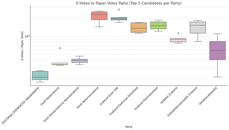 Alumine graafik näitab e-häälte osakaalu iga erakonna 5 suurema häältemagneti puhul. Näeme sama seaduspära.