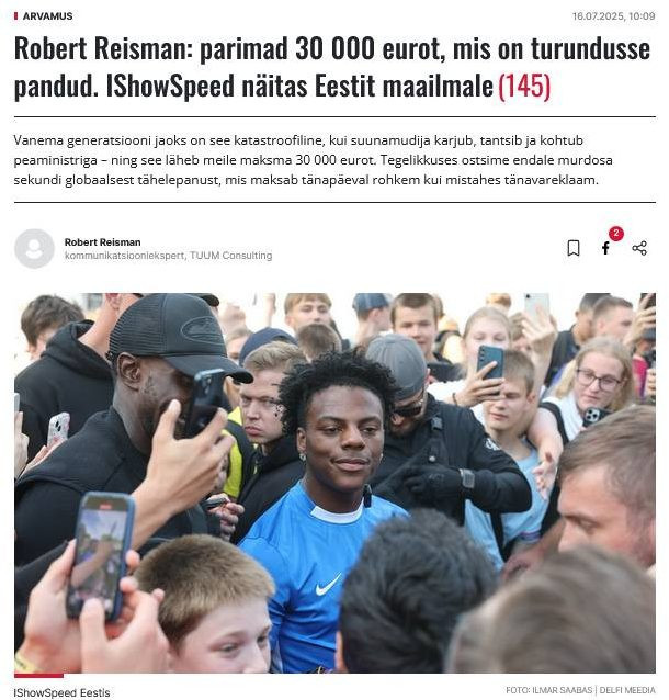 Tere tulemast tippklassi maksupõhise pehme jõu diplomaatiasse: 30 000 euro eest korraldatud IShowSpeedi külaskäik Tallinna. Sest kui miski Eesti turismistrateegias puudu oli, siis kindlasti 19-aastase ameeriklase heakskiit, kelle jälgijad ei oska sõnagi "Estoniat" kirjutada, rääkimata sinna reisimisest.