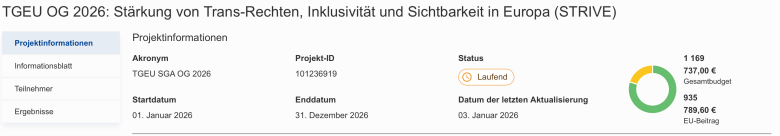 Selle töö tihedat seost Euroopa institutsioonidega näitab käimasolev ELi projekt kodanike, võrdõiguslikkuse, õiguste ja väärtuste programmi (CERV) raames. Pealkirja "TGEU OG 2026 – Transsooliste õiguste, kaasatuse ja nähtavuse tugevdamine Euroopas (STRIVE)" all saab TGEU 2026. aastaks rahastamist kogueelarvega 1 169 737 eurot, millest 935 789,60 eurot (peaaegu 1 miljon eurot) tuleb otse ELi vahenditest.