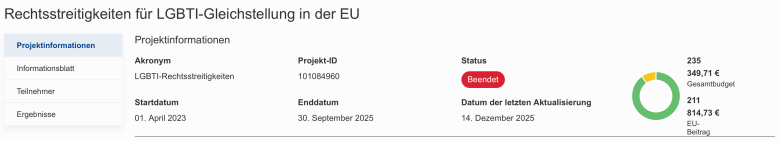 Konkreetne näide ILGA-Europe'i ELi rahastamisest on projekt pealkirjaga "LGBTI kohtuvaidlused", mis kestis aprillist 2023 kuni septembrini 2025. Kogueelarve on 349 717 eurot, millest 211 814,73 eurot tuleb otse ELi vahenditest. Projekti kirjelduse kohaselt on eesmärk süstemaatiliselt laiendada LGBTI õiguste strateegilist kohtuvaidlust riiklikul ja Euroopa tasandil, tugevdada liikmesorganisatsioonide, juristide ja inimõiguste võrgustike suutlikkust ning suurendada selliste kohtuasjade arvu kuni Euroopa Kohtuni.