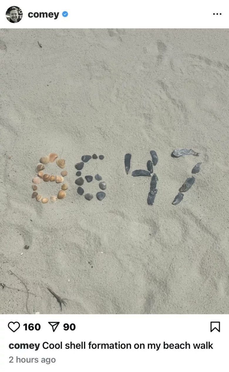 Selle nädala alguses jagatud postituses oli näha numbrit "8647", mis oli liiva sisse paigutatud karpide ja kivide abil. Comey lisas sellele pealkirja: "Lahe karpide moodustis minu rannateel." Kuigi esmapilgul tundub see süütu, tekitas see number tõsist muret.