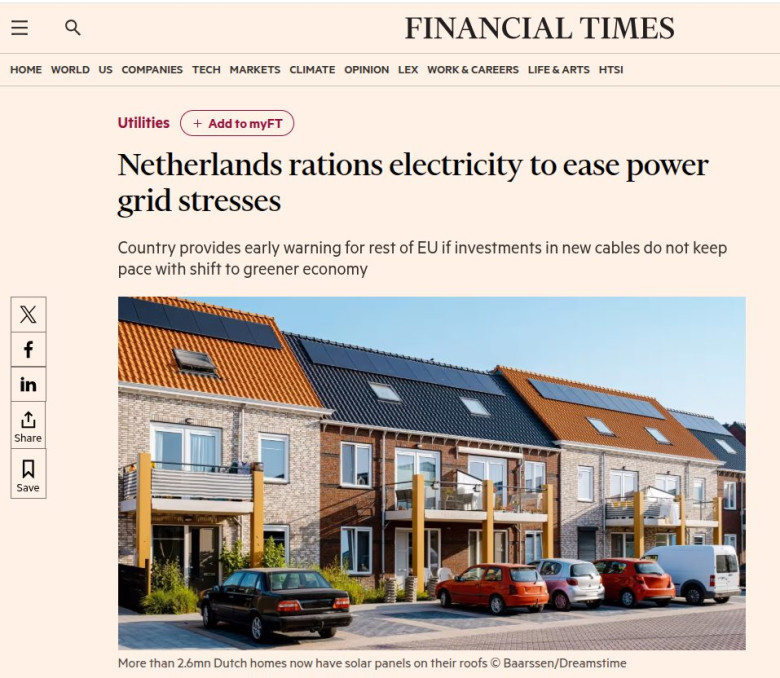 Financial Times kirjutab täna sellest, et Hollandi majandus ja konkurentsivõime on suure löögi alla, kuna elektrivõrk ei võimalda enam ettevõtetel tootmist laiendada ning asi on läinud niikaugele, et ka majapidamiste elektrikasutust tuleb piirama ja reguleerima hakata. "Holland on hoiatavaks näiteks ülejäänud Euroopale!"