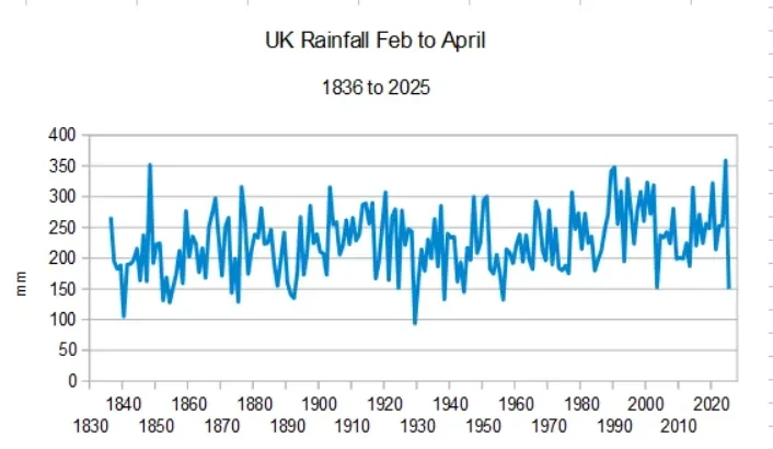 Tegelikult algas kuiv ilm juba veebruaris – meil on olnud kõige kuivem veebruarist aprillini kestev periood alates 1956. aastast. Kahtlemata süüdistatakse selles lõpuks kliimamuutusi, kuid nagu allolev diagramm näitab, olid mitmed teised aastad, näiteks 1840 ja 1929, nende kolme kuu jooksul palju kuivemad.