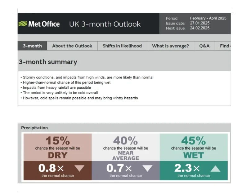 Kuid eriti silmatorkav on ilmateenistuse täielik suutmatus midagi sellist ette näha. Nende 31. jaanuaril avaldatud kolmekuuline prognoos teatas, et periood on tõenäoliselt märg ja tormine ning vaid väikese tõenäosusega on see keskmisest kuivem!