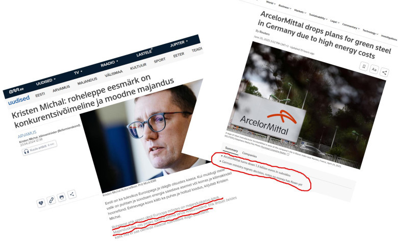 Illustratsiooniks tänase peaministri mõtted aasta tagant ja värske Reutersi uudist sellest, kuidas ArcelorMittal isegi vaatamata saada olevale 1,3 miljardilisele riigi toetusele roheterase tehase plaanid prügikasti saadab!