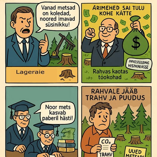Kõige traagikoomilisem osa? Need, kes kogu selle segaduse üles keerasid, istuvad nüüd rahulikult kuskil ülikoolis, kirjutavad teadusartikleid ja õpetavad noori, kuidas paberil mets kiiremini kasvama panna. Samal ajal kuulutab valitsus uue muinasjutu: "Me päästame majanduse!" – muidugi veel mõne hektari arvelt.