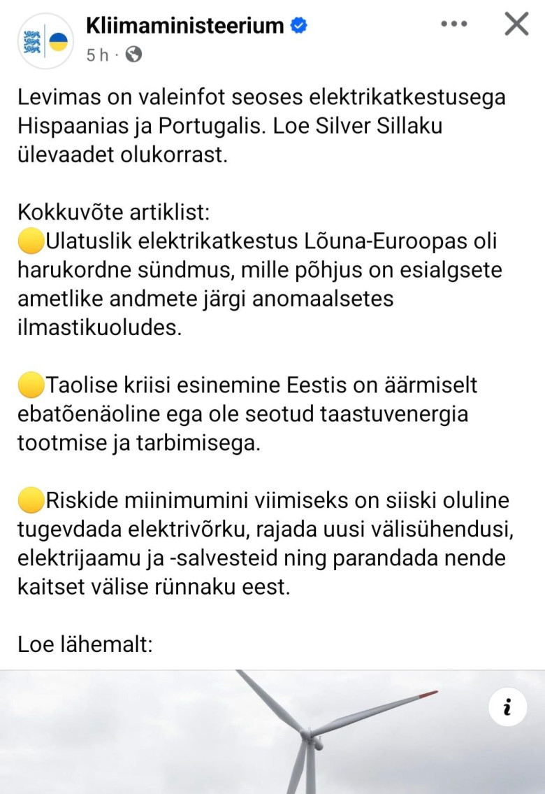 Täiesti südantsoojendav, kuidas meie enda kliimaministeerium lükkab ümber valeinfot, mida levitatakse sellest, nagu oleks ulatusliku elektrikatkestuse Lõuna-Euroopas põhjustanud erakordne sündmus, mille põhjus oli anomaalsetes ilmastikuoludes! Valeinfo on ka välja toodud punkt-punkti haaval nagu kord ja kohus ja illustreeritud isegi näitega.