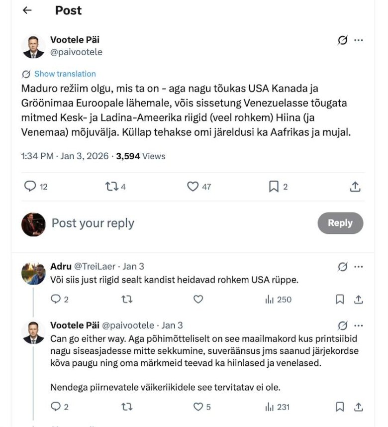 Lõppkokkuvõttes need, kes otsivad selle sekkumise loogikat ExxonMobili bilanssidesse, seda valest kohast. Asi polnud ettevõtete kasumis. Asi oli 21. sajandi suures malelauas. Maduro vahistamine oli ennetav käik, kaardipakkide puhastamine pikemaks suurriikide võistlusmängudeks. Ameerika Ühendriigid on otsustanud, et kui nad peavad Vaikse ookeani piirkonnas lohega silmitsi seisma, siis nad ei lase sel endale Kariibi mere piirkonnas kuklasse hingata.
