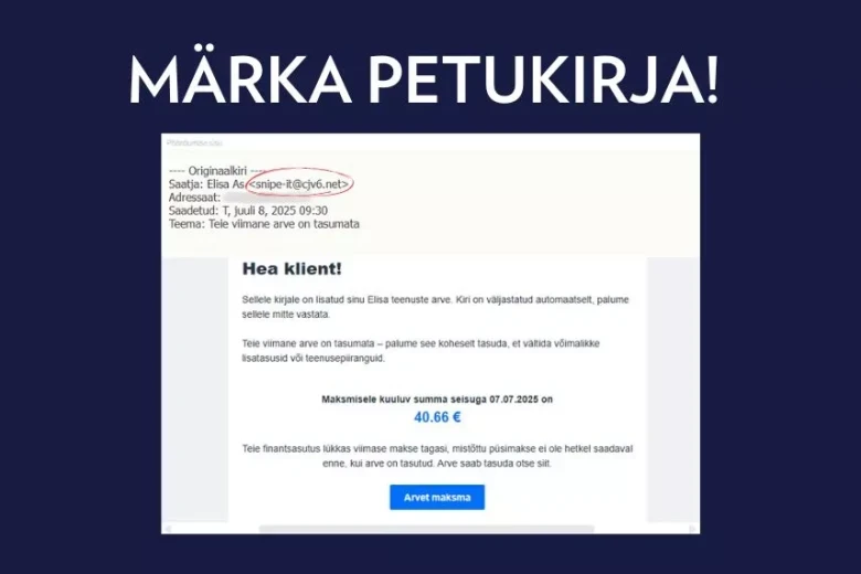 Palun ole tähelepanelik ning enne maksmist kontrolli alati üle, kas arve tuleb Elisa ametlikult meiliaadressilt.