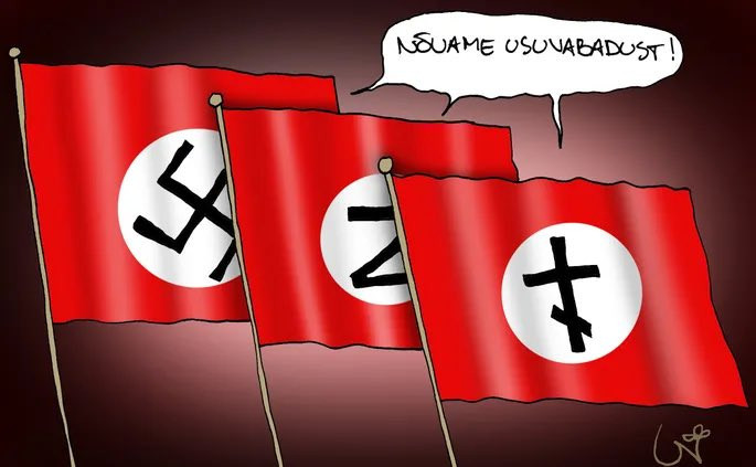 Karikatuuril on kujutatud on nn õigeusu risti - see sama rist on ka Konst. patriarhaadi alluvuses oleva kiriku sümbol. Niipalju võiks postimehed ikka teada enne lahmimist...Eriti irooniline, et õigeusu ja natside sümboolika pildil ühes leeris. No ma ei tea.