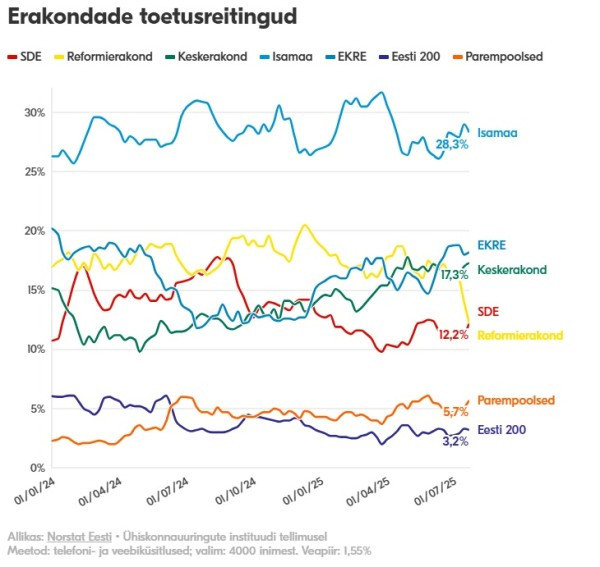 Reformierakonna toetus langes nädalaga 1,8 protsendipunkti võrra ning on alates juuni keskpaigast langenud viie protsendipunkti võrra ja pole Norstati küsitlustes varem nii madal olnud. Sotside toetus tõusis nädalaga protsendipunkti võrra ning on praegu võrdne Reformierakonna toetusega.
