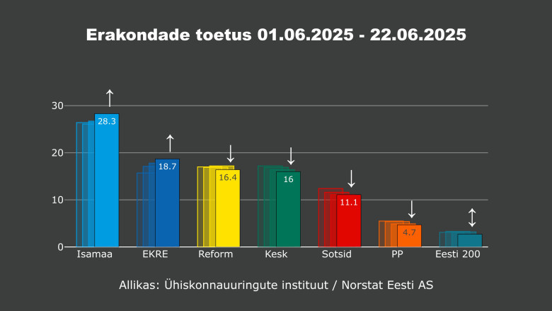Valimiskünnise kohal rohkem erakondi ei ole. Parempoolsed on teist nädalat uuesti valimiskünnise all ning nende toetus hetkel kosumise märke ei näita, pigem vastupidi. Parempoolsete toetus on olnud langustrendis alates mai lõpust. Eesti 200 toetus on samuti kahanemas ning nende reiting on hetkel 2.7%. Kahte valitsuserakonda toetab seega kokku vaid 19.1% erakondliku eelistusega valijaskonnast. Kogu valijaskonnast (arvestades ka erakondliku eelistuseta valijaid) on see protsent aga ainult 13%. Ainult umbes üks kaheksast Eesti kodanikust toetab praeguseid valitsuserakondi.